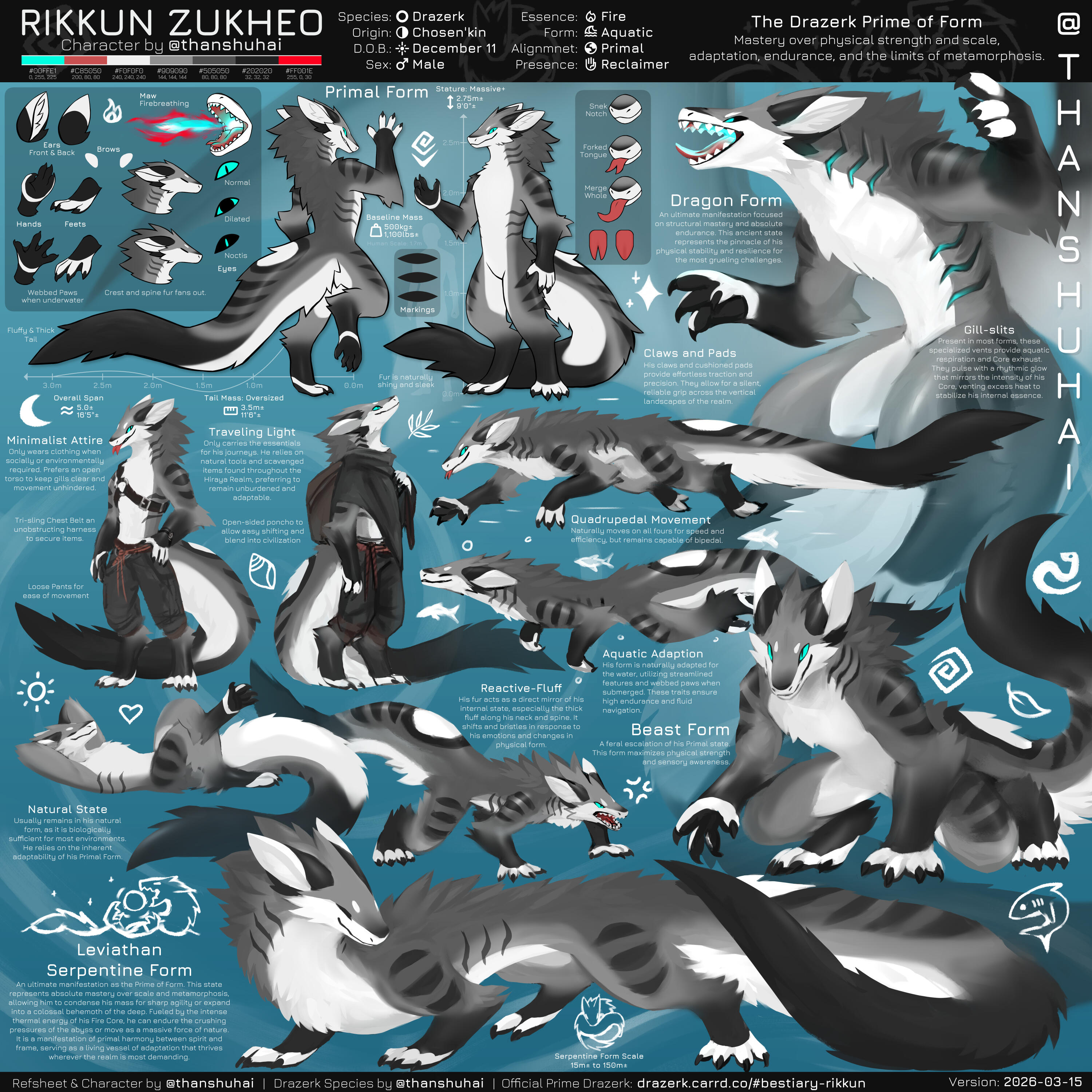 My journey as a creator began in 2011. It was a love for dragons that first drew me into the furry community, and my work has been evolving ever since. This passion was rooted in my childhood, influenced by my Vietnamese mother and the diverse depictions of dragons I grew up with. From western and Chinese styles to the elegant Rồng of Vietnam and the Bakunawa of Philippine mythology, these creatures always fascinated me.Along the way, I spent a lot of time exploring different ideas, including a long-standing fascination with werewolves and the concept of Metamorphosis. These themes of fluid and primal form became the foundation of what I truly wanted to draw. To me, transformation is more than a fantasy trait, it is a vessel to express yourself and interact with the world and nature in unique ways. It means not being stuck in one fixed design, but being able to change to match what you want to express in a way that feels natural. After exploring other expressions, species, and identities for years, my journey eventually came full circle.This return to my roots led to 2021, where after over a decade of artistic growth, these influences converged into my most personal project: the Drazerk species. Growing up in a coastal area and now living in the mountains of the Philippines, my deep love for the beach, the ocean, mountains, and nature became a core part of my creative DNA. The Drazerk design is a tribute to these roots, mixing four main inspirations: the mythical power of a dragon, the sleek, fluid form of a shark, the winding grace of a snake, and the sharp, crested look of the Philippine eagle. While the species has been open for some time, 2026 marks the year I am officially publishing them for the public with a full vision and dedicated home. This year has been about revisiting the species to finally lock down their anatomy and internal mechanics, ensuring the vision is fully realized.I often see myself more as a technical person. This mindset naturally flows into my work, as I love diving into the inner workings of a species and the worlds they inhabit. Before creating my own, I spent years delving into the communities of other species. I loved being a part of them and supporting other creators, which gave me so many wonderful inspirations. These experiences shaped how I approached the Drazerk. I want this species and universe to exist and live alongside the many other incredible worlds that are truly inspiring.As species creator, I simply provided the first catalyst. My role is to give the species a biological foundation and a place to start, while the community is what really makes them come to life with their own characters. My goal is to create a species that offers a canvas where identity is not restricted by a single form, but empowered by the ability to evolve. I want to create art that feels alive and naturally inspired. I am incredibly grateful to the community, the Drazerk Kin, and the wonderful people whose support and creativity continue to inspire me to evolve and grow this species.Ultimately, my journey has taught me that a project like this is a living ecosystem that evolves alongside its creator and its community. As I look toward the future of the Hiraya Realm, my focus is on the depth of the world we are building together. I will continue to paint and draw as much as I can within this world, capturing its growth as the Drazerk represent the idea that we are all a collection of our roots, our passions, and our changes. Whether you are drawn to the depths of the ocean or the heights of the mountains, there is a space for you here. I invite you to find your place, embrace your own change, and join me in watching this world grow as everyone adds their own stories. This world is meant to remain fully open for the community to carry forward.
