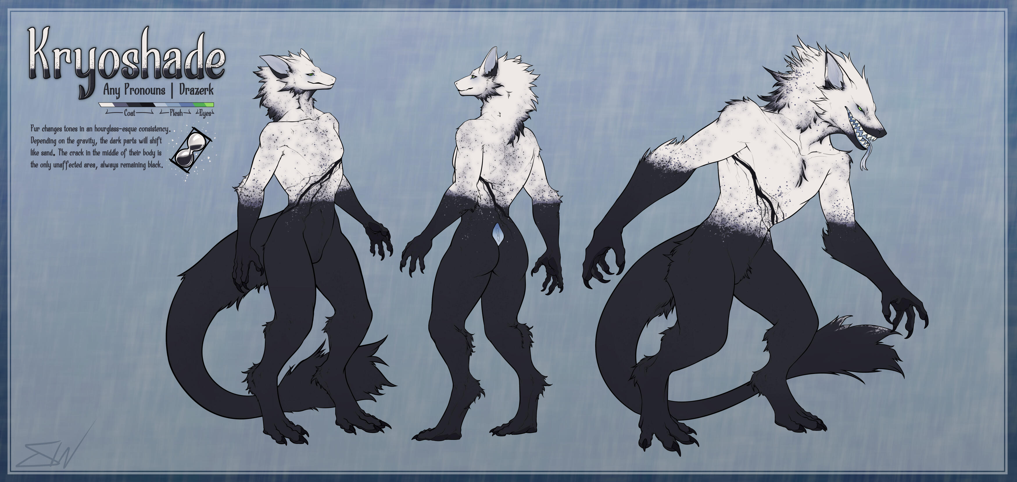 Kryoshade has monochrome fur, whose density reacts to gravity and whose torso bears a crystal crack, a vestige of his ancient emotional breakdown.Born without roots, he wandered seeking the happiness of others until the weight of sacrifice broke him.In his darkest hour, he asked Lum, a comet, for happiness, and it turned out to be what transformed his pain into purpose.Kryoshade is an architect of the abstract, He has transcended the material plane to inhabit the void, from where he safeguards the chronology of fictional worlds and their impact on reality, a task of surgical precision.He ensures entropy, maintains order between the existing and the imagined, and offers spiritual refuge to the condemned in fictional worlds, He is a being who knows the answers before asking, acting with the coldness of a cosmic judge, yet with the absolute empathy of one who feels every joy and every wound of others as if it were his own.A necessary shadow that repairs chaos from silence.