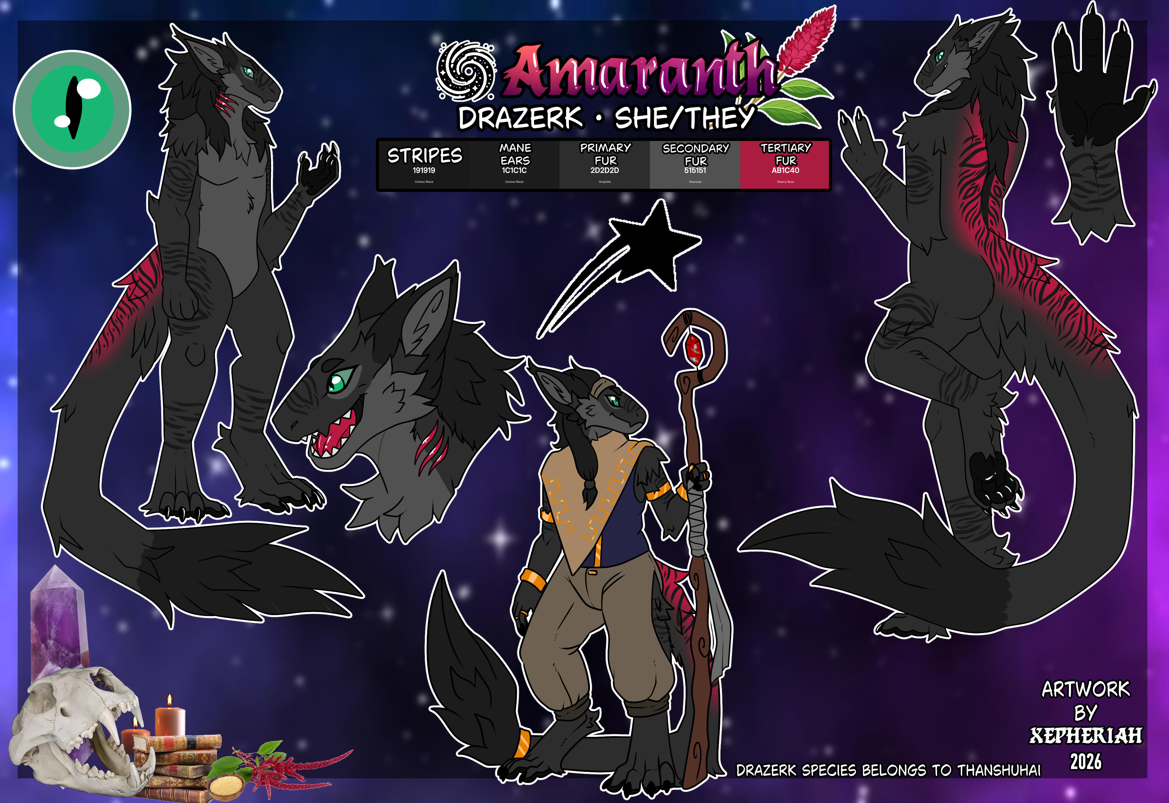 Born in the dark heart of the forest in the essence of the void, Amaranth is a female Drazerk who walks in the shadows. With a strong interest in the occult and sometimes macabre, she often searches Hiraya for crystals to keep with her. She is mostly a nomadic wanderer, floating between bastions and the wilds commonly. On the rare occasion, she will wear clothing for aesthetic purposes. She mostly likes golden jewelry of any kind.Her personality is quiet with a bit of a bite when she needs to. She carries herself with pride and grace. She is fiercely protective of those she finds kinship with. She mostly presents herself as the quiet, stoic one to strangers but when she is comfortable, she is much more open and friendly.Aside from being nomadic, Amaranth seeks knowledge of the void. Her desire for knowledge encouraged her to become a nomad. This is where you can find her now; roaming the landscapes of Hiraya in search of knowledge.